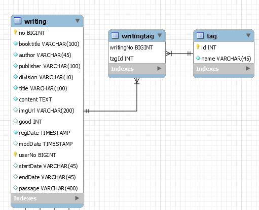 tagId는 입력받은 tag의 name을 가지고 가져올 수 있으나, writing의 경우에는 no를 가져올 방법이 없었기 때문이다.