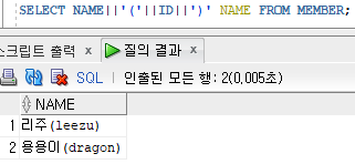 문제. 모든 회원의 이름을 조회하시오. 단 이름은 ID를 붙여서 나타내시오. ex) 홍길동(hong)
